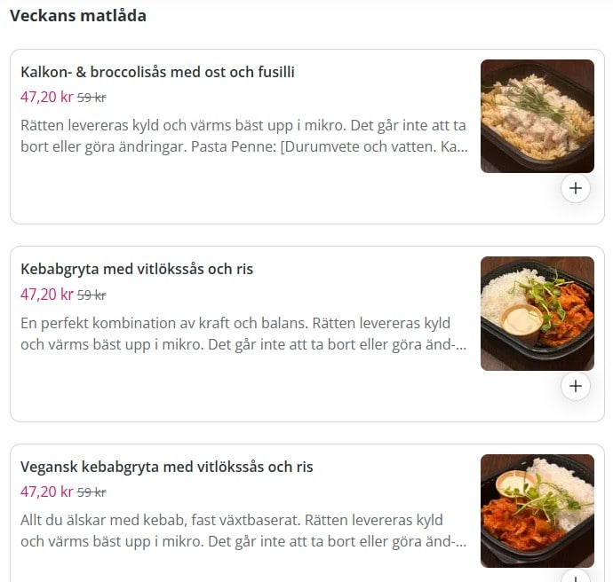 Genom Foodora erbjuds varje vecka ett urval av rätter från skolornas meny. Maten kan levereras hem eller hämtas direkt i skolrestaurangen. Matlådorna är nedkylda och färdiga att värma, och priset är satt för att vara tillgängligt snarare än vinstdrivet.